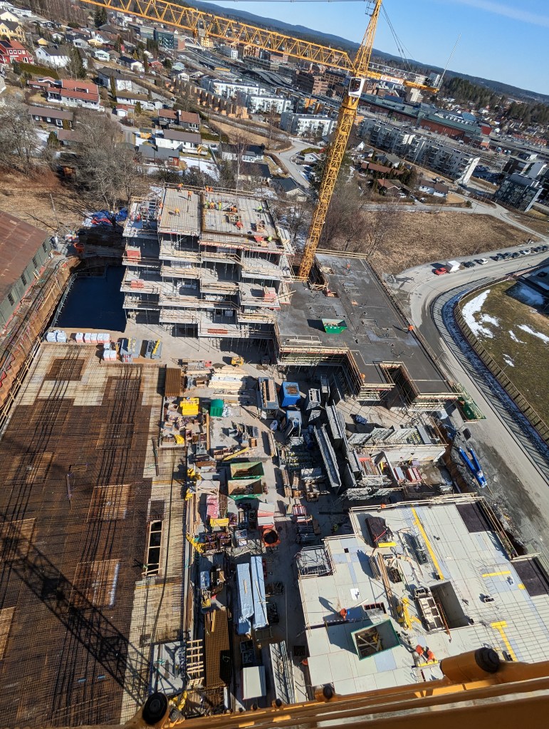 Selv om vinteren ikke vil slippe taket så er det god fremdrift på byggeplassen. Bildet ble tatt tirsdag denne uken i nydelig byggevær. Byggeplassen har drift mandag-onsdag i påskeuken, det er etablert vakthold i helligdagene.