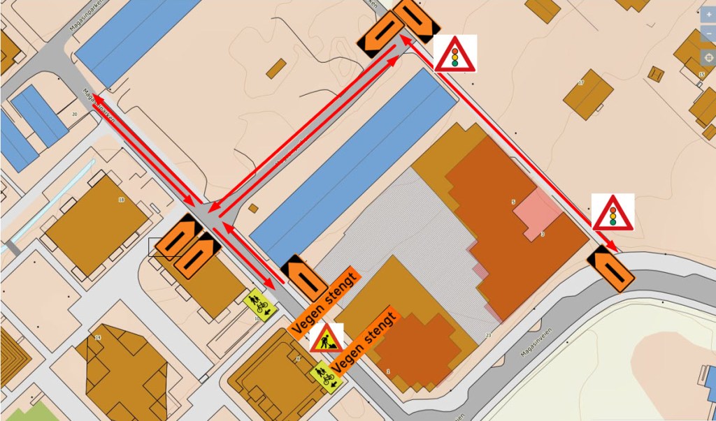 Avsperring og omkjøring vil bli skiltet. Se skiltplan nederst på innlegget.